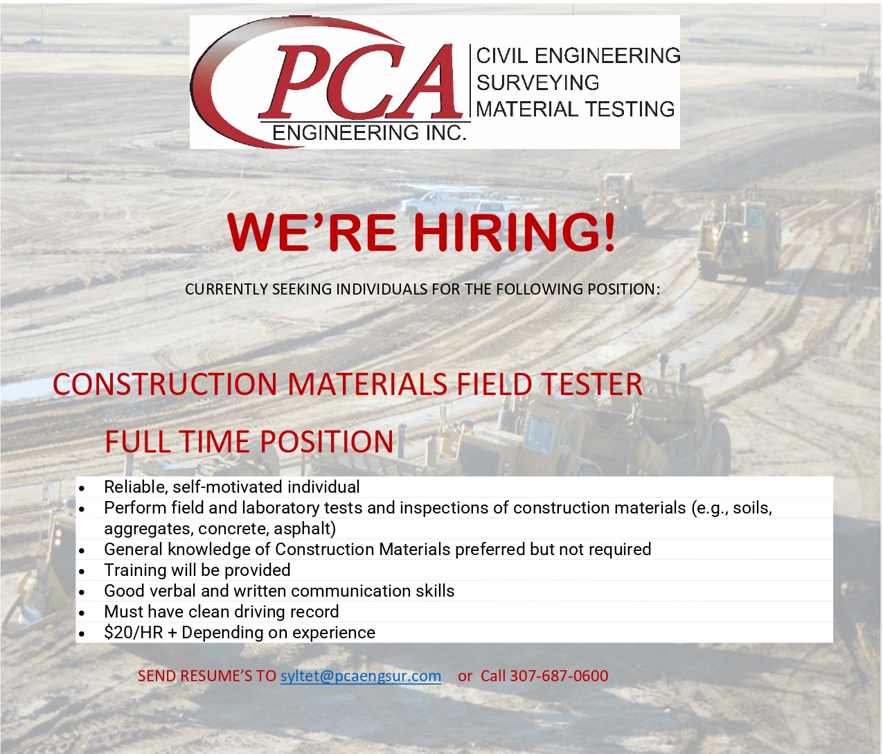 PCA Engineering, Inc. has provided a range of civil engineering and land development services in Gillette, WY since 1993. We maintain an outstanding record of service and have expertise in a variety of areas including: geotechnical engineering, land surveying, contract administration, material testing, and construction observation.
